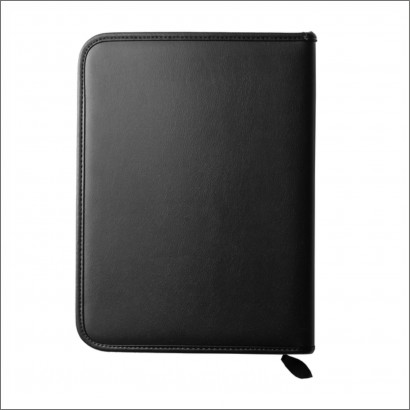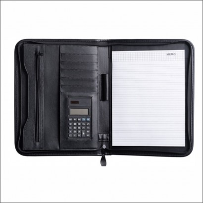 Wykonana z ekoskóry czarna teczka trenerska A4 z kalkulatorem, zapinana na zamek. Posiada aż 6 kieszonek, przegródki na dokumenty, uchwyt na długopis i kieszeń z zamkiem.