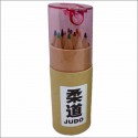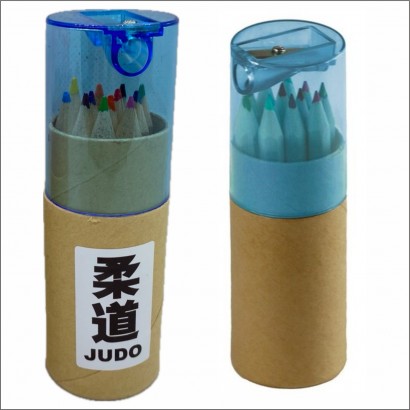 Kredki Judo. Zestaw 12 kredek w okrągłym pudełku zamykanym kolorową zatyczką z wbudowaną temperówką i naklejką JUDO