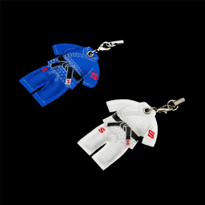 Ten model jest idealną miniaturą białego lub niebieskiego judogi z czarnym pasem. Oba mają czerwone logo KuSakura „S” na kurtce, spodniach i pasie.
