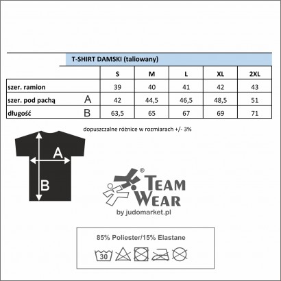 Koszulka damska wykonana z dwóch różnych tkanin poliestrowych. Przód z pełnej tkaniny typu "silk touch", tył tkanina typu "mesh" delikatna siateczka. Specjalnie zaprojektowana dla Reprezentacji Polski Judo. Dynamiczna grafika z motywem orła z przodu oraz z tyłu. Godło na lewej piersi oraz logo Polskiego Związku Judo na rękawie wykonane w technice 3D. Na plecach silikonowy napis POLSKA.