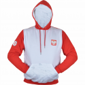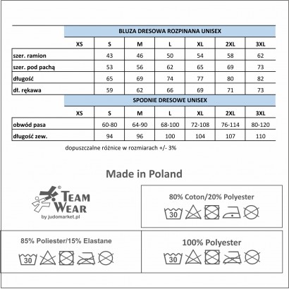 Dres składa się z rozpinanej na suwak góry oraz spodni w gumkę ze sznurkiem. Dres unisex. Wykonana z dziany poliestrowej. Specjalnie zaprojektowana dla Reprezentacji Polski Judo. Dynamiczna grafika z motywem orła z przodu oraz z tyłu. Grafika na spodniach z motywem przewodnim dla całej kolekcji. Godło na lewej piersi oraz logo Polskiego Związku Judo na rękawie wykonane w technice 3D. Na plecach oraz rękawie silikonowy napis POLSKA. Na spodniach godło oraz logo Polskiego Związku Judo oraz na dole nogawki napis POLSKA wykonany z silikonu.
