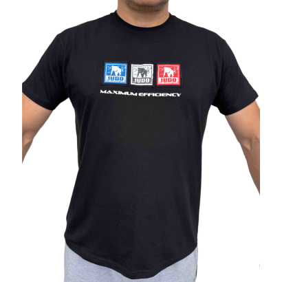 Koszulka bawełniana 190g. Bardzo dobrej jakości. Z przodu trzy kwadratowe aplikacje z nadrukiem techniki judo, przyszyte do koszulki. Pod spodem napis MAXIMUM EFFICIENCY (maksymalna efektywność)